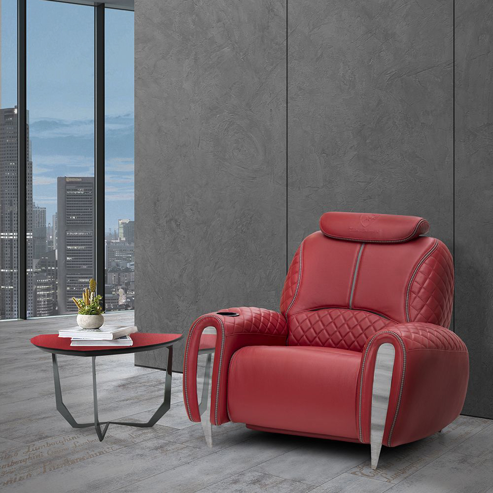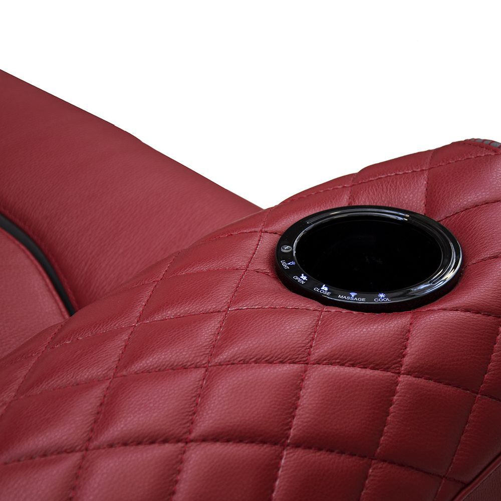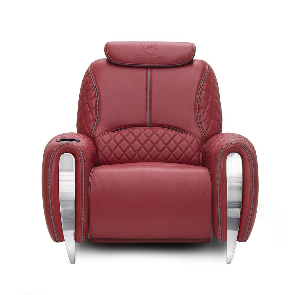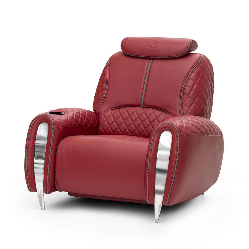Cup holder with full option on arm including: light, glass can cooler, massage, open/close electric mechanism. Seat, back & arms in leather Deer col. Form Sand with piping on backrest in leather Deer col. 298 Root, with inserts on top of arms in quilted leather, tone on tone stitching, inserts on frontal arms in nickel bronze, with manual mechanism for headrest & printed TL logo.